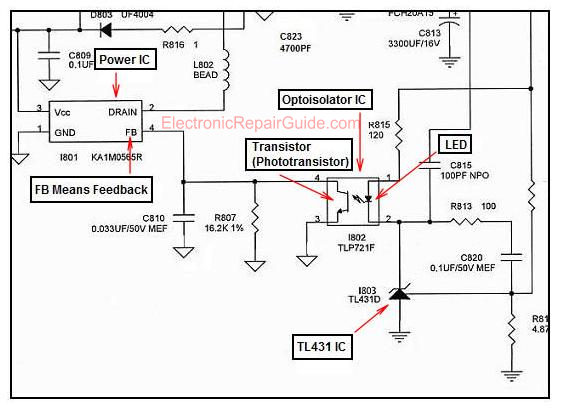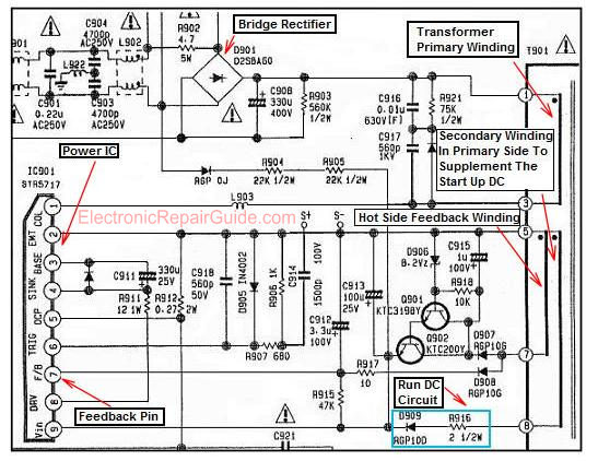 Al observar la energía (IC IC901) el número de pin 7, Por favor escribir como F / B, que son los medios de la regeneración. El seguimiento hacia atrás, de este pin, que le llevará a los comentarios de liquidación en el pin 7 del T901.